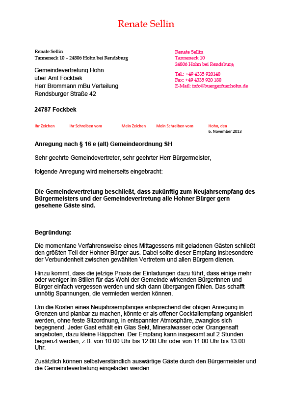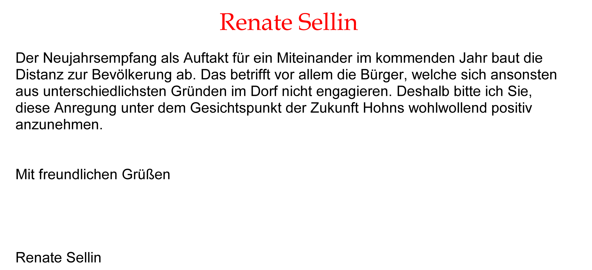 Wie bereits von uns der Veröffentlichung der Einladung zur Sitzung des JKS- Ausschusses hinzugefügt, regen wir eine Neuordnung des Neujahrsempfanges an.Wir würden es begrüßen, wenn jeder Hohner ein gern gesehener Gast des neuen Bürgermeisters und der Gemeindevertretung wird anlässlich dieses Empfanges. Es schmälert in keiner Weise die Würdigung von ausdrücklich geladenen Ehrengästen und wäre ein Schritt auf die Bürger zu. Da die BfH selbst keine Anregung einbringen darf, hat wiederum unser Vorstandsmitglied Renate Sellin das übernommen. Der Vorsitzende des JKS- Ausschusses, Herr Frahm, wurde vorab per E- Mail von uns über die Anregung informiert.