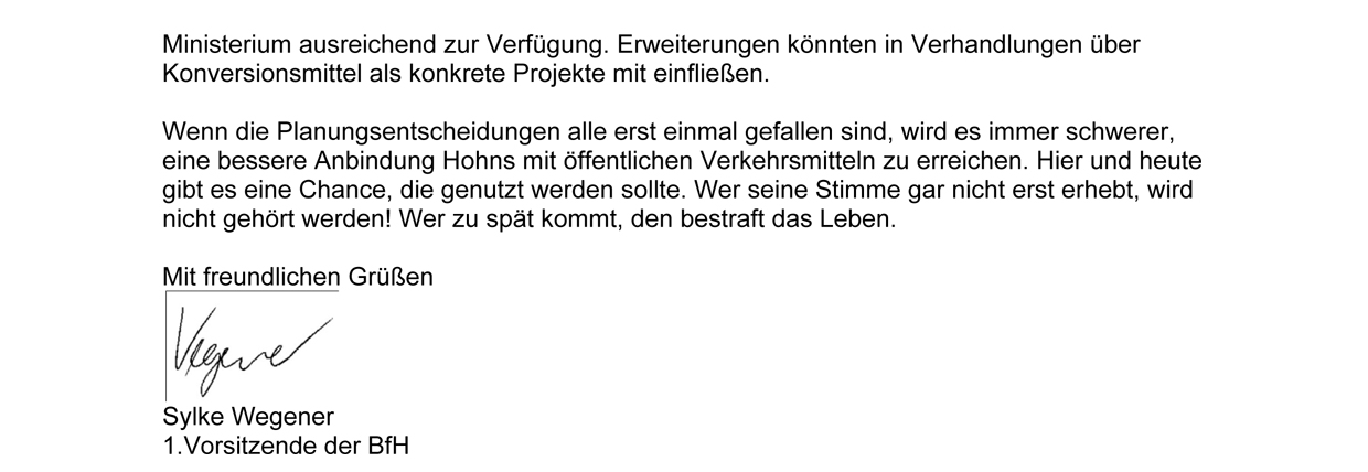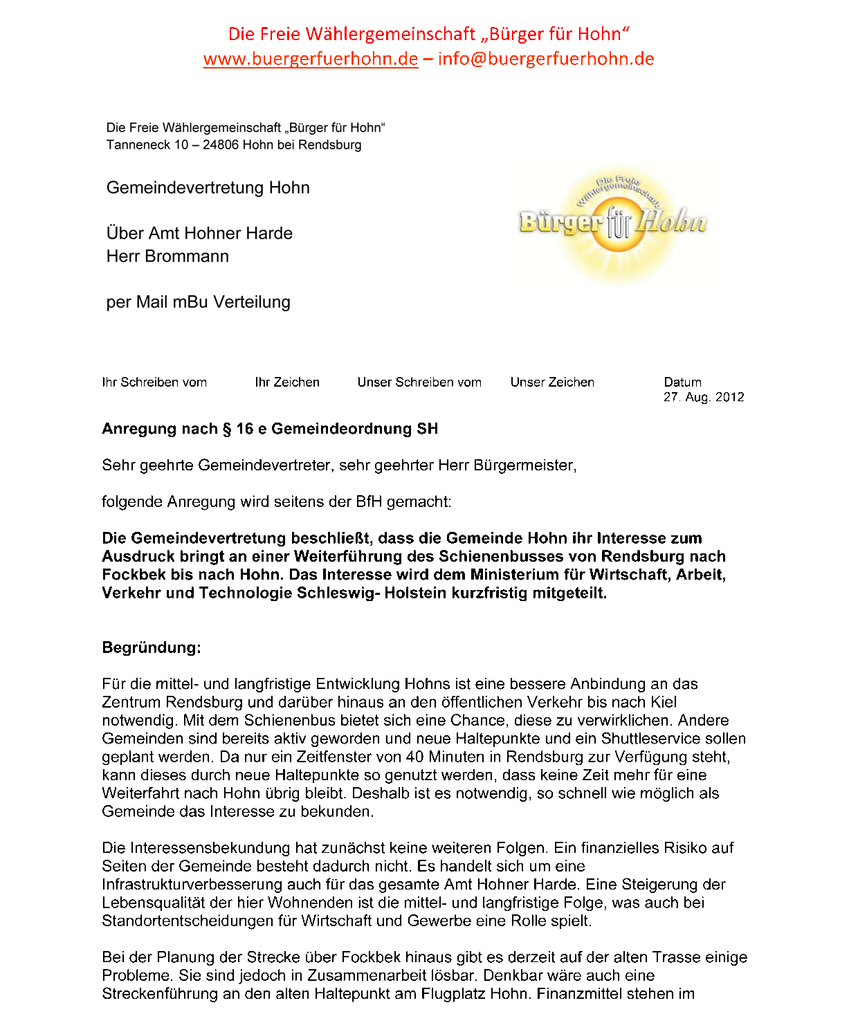 Die erste Vorsitzende der BfH hatte nach ihrem Gespräch mit dem zuständigen Referatsleiter im Wirtschaftsministerium in Kiel zwischenzeitlich ein Gespräch mit dem Fockbeker Bürgermeister Herrn Gilgenast und Herrn Stelter vom Amt. Darin wurde deutlich, dass die Weiterführung des Schienenbusses von Fockbek nach Hohn einige Probleme mit sich bringt, da die gewesene Trasse zum Teil überbaut ist bzw. Abstandsprobleme zur Wohnbebauung auftreten. Hier müsste neu nachgedacht werden. Doch das ist erst der zweite Schritt. Der erste Schritt besteht darin, gegenüber dem Wirtschaftministerium und damit auch gegenüber der Nachbargemeinde Fockbek das entsprechende Interesse der Gemeinde zu äußern.